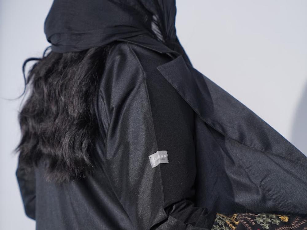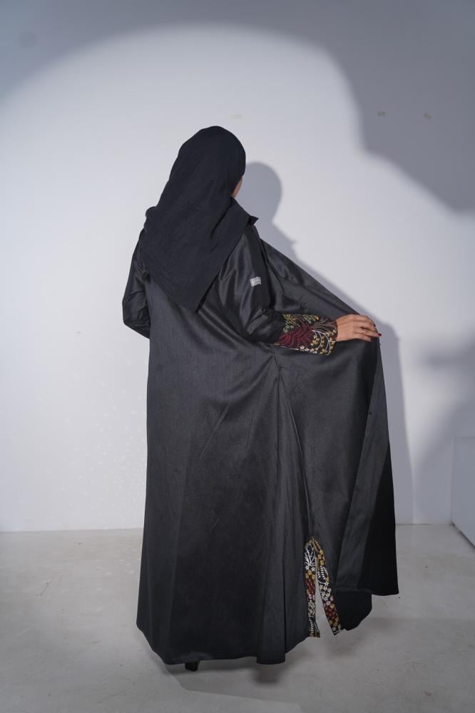 قماش العباية تفته شانتون اسود سادة، الاكمام والقطعة الخلفية تفته شانتون بنقش هندي، طرحة شيفون اسود سادة، قصة نص كلوش.